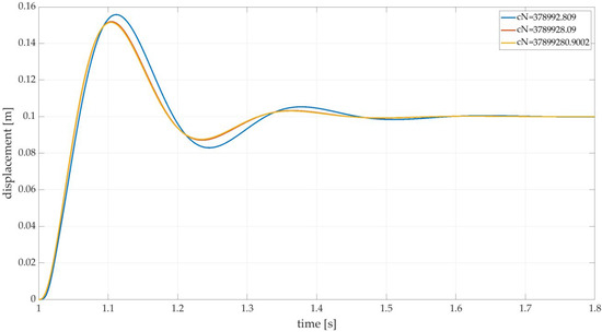 In this simulation, the input by the road is in the shape of a step function with an amplitude of 100 mm. The system’s eigenfrequency [
