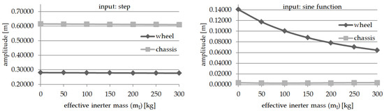 mI of about 5 kg. This is close to the low point of the chassis oscillation at a sine input and to the minimum of the amplitude by the wheel based on a step input. Furthermore, the amplitude of the chassis for a step input is reduced by 3.0%. On top of that, at a