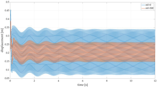 mI of 0 kg the amplitude of the wheel is 0.141 m (blue) and drops by 54% to 0.064 m (red) at a