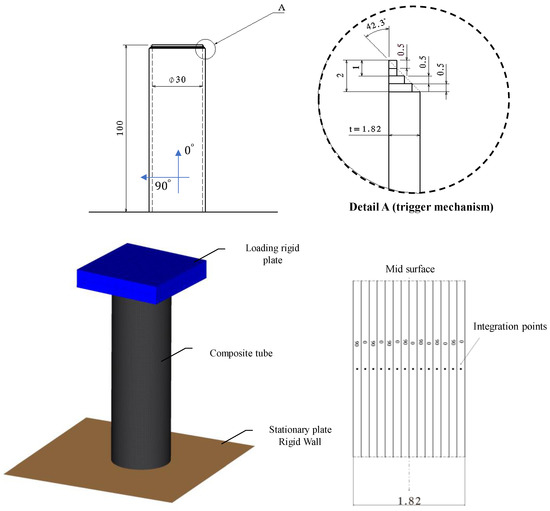 Dimensions of the composite tube, fiber orientation, trigger mechanism, and FE model using LS-DYNA (units are millimeters and degrees, respectively).