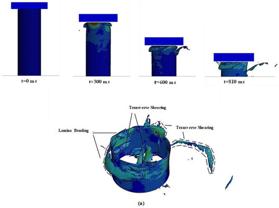 The failure mechanism of the composite tube was modeled using the Tsai-Wu theory [38]. The MAT_ENHANCED_COMPOSITE_DAMAGE (MAT 54/55 keyword in LS-DYNA) was used to model the damage in the composite tube. Based on the Tsai-Wu theory the failure criterion for the compressive fiber mode, tensile matrix mode, and the combination of tensile and compressive matrix mode are given as following equations respectively:
