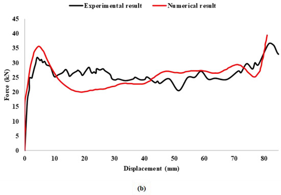 Numerical simulation results (a) and the force-displacement comparison (b).