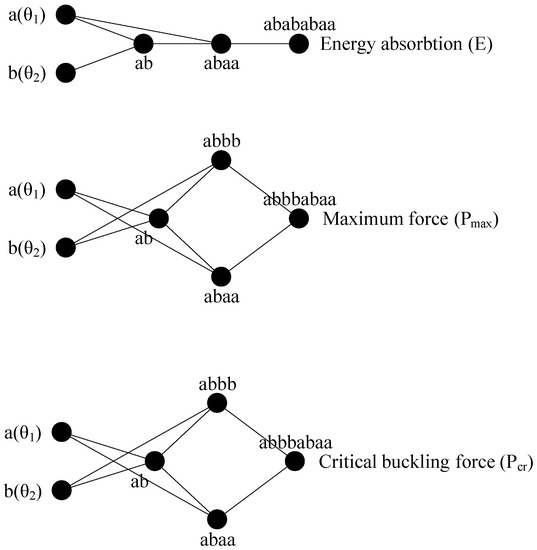 Evolved structure of generalized GMDH neural network for the energy absorption, the maximum force, and critical buckling force for n = 9 layers.