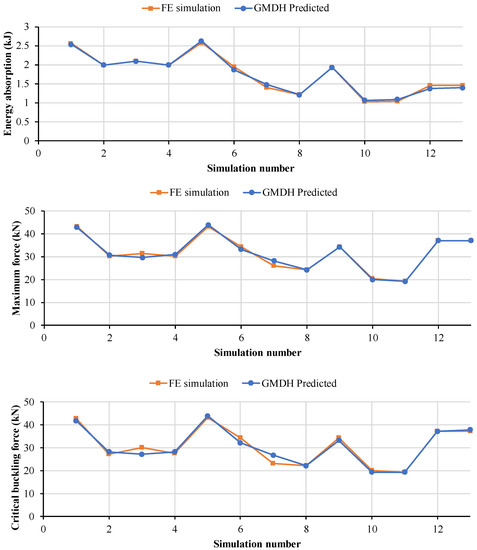 Table 4 summarize the results inputs and outputs resulted from FE simulations and GMDH-type (for n = 9 layers). Figure 6 shows the comparison between the two model’s outputs including critical buckling force, maximum force, and energy absorption. The results indicate that the GMDH-type neural network was adequate enough to predict the objective values for different inputs.
