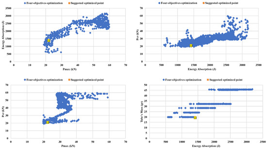 The evolutionary process of Pareto multi-objective optimization has been conducted using the modified NSGA-II method [40]. In this method, the population size of 60, with the crossover probability (Pc) of 0.7, and the mutation probability (Pm) of 0.07 was defined. Figure 7 shows the results of all four objectives resulted from this optimization process. It also shows the best possible design point that has the minimum weight with a high capability of energy absorption. The plots are showing the existed relationship between the outputs. For example, energy absorption increased when the peak force went up.