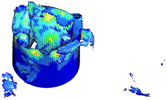 The highlighted point it the optimum decision vector which satisfies all the objectives and constraints defined in this analysis. The optimized values were obtained for the tube with five layers and a total mass of 19.6 g with the fiber direction of θ1 and θ2 equal to 0 and ±86 degrees, respectively. Furthermore, the optimum design was also simulated in LS-DYNA and Figure 8 shows the failure mechanism of this composite tube with the [0/±86]5 layers. The progressive crushing mechanism, which according to the literature [8,19] has the highest energy absorption capability, was observed from this simulation. Furthermore, the results from the FE simulation is very close to the values predicted by the GHMD-type neural network which confirms the reliability of this model for the optimization process (see Table 6). The FE simulation and GMDG prediction of crashworthy behavior of optimum design point showed that we can reach the same SEA (72.6 kJ/kg) as our experimental model, by using the aforementioned fiber direction and number of layers while decreasing the weight by 30%.
