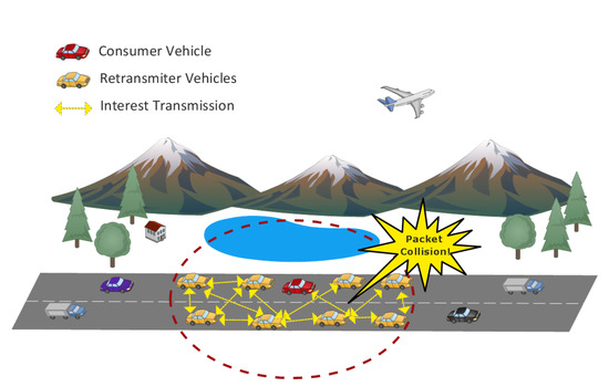 From Figure 1, the consumer vehicle initially transmits an interest packet specifying the content’s name on the network. Then, the neighboring vehicles receive the packet. Since they do not have the corresponding data packet in the cache, all receiver vehicles will simultaneously retransmit the interest packet on the network. The result of these multiple retransmissions is the collision of packets. It is necessary to develop VNDN-tailored interest packet forwarding intelligent solutions, with the ability to reduce excess transmissions and enhance the efficiency in content delivery, in an attempt to mitigate the occurrence of a broadcast storm.