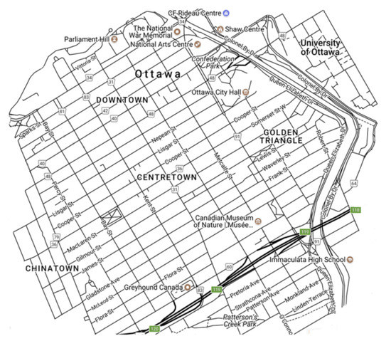 The proposed protocol assessment was carried out leveraging computer simulations. In light of this, the OMNeT ++ 4.6 (http://www.omnetpp.org/) and the Vehicles in Network Simulator (Veins) (http://www.veins.car2x.org/) tools were used to reproduce the behavior of the implemented protocols. The Canadian Ottawa city map (importing the city area (2 km) through the OpenStreetMap (http://www.openstreetmap.org)) was defined to generate vehicle mobility patterns using the Simulation of Urban Mobility (SUMO) 0.21.0 (http://www.dlr.de), as shown in Figure 3.