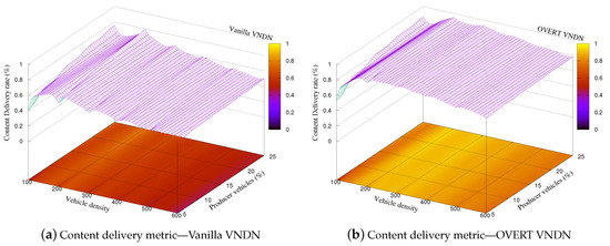 Figure 5 shows the content delivery KPI. In the beginning, which showed a reduced vehicle density (100), as well as a small number of producers (5%), the content delivery rate was low for both Vanilla VNDN (Figure 5a) and OVERT VNDN (Figure 5b). However, as the number of producers increased from 5% to 25%, the content delivery rate also increased. Nevertheless, OVERT VNDN outperformed the Vanilla CNDN solution regardless if the variation of both the vehicles’ density and the number of producer vehicles used, for which the heat map provides evidence. On average, OVERT VNDN reached 83.33% of the content delivery rate against the 58.02% of Vanilla VNDN, which revealed an improvement index of more than 43%. The cache discovery strategy that OVERT VNDN adopted, which allowed minimizing the broadcast storm problem during the coarse of the cache discovery process, suggested the reason behind this improvement. Furthermore, as the vehicle density increased in the network (from 100 to 300 vehicles), the coverage rate also increased. However, when the scenario became denser (from 400 to 600 vehicles), the trend was that the performance rate of both protocols began to degrade in regards to content delivery. The existence of many vehicles transmitting interest and data packets on the network, which consequently resulted in higher packet collision incidence, hinted at the cause.