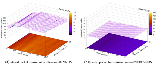 The average number of interest packets transmitted in the cache discovery process, to retrieve the desired content (Figure 8), was the last KPI assessed. As anticipated, when the number of producer vehicles increased on the network, the number of interest packets transmitted decreased in the stage of searching for content. On average, OVERT VNDN (Figure 8b) reduced by 80.99% the number of transmitted interest packets in comparison to Vanilla VNDN (Figure 8a). This reduction was achieved because of the interest forwarding strategy that relay vehicles adopted, which was based on the computational geometry and degree centrality of the receiver vehicle. This strategy owed the ability to cancel already scheduled interest packets that no longer needed. Besides, the proposed approach allowed only vehicles that had neighbors to continue to propagate the interest packet through the network. On the other hand, vehicles without neighbors discarded the interest packet because they would not reach potential producer vehicles.