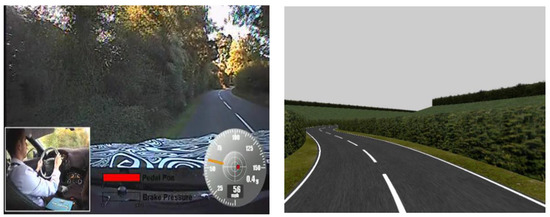 The road used for the experiment, shown in Figure 1, is a 60 mph narrow rural road, including both straight segments and curves of varying radii. It is part of a public road circuit, starting and ending at the JLR Gaydon site, Coventry, UK. For the simulator, a LIDAR 3D scan of the road circuit was converted for use with OpenSceneGraph.