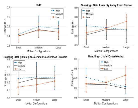 There was a significant effect of MP on the vehicle’s ride attribute quality, . Contrasts revealed that ratings of medium and large MPs were significantly different from the small. From the Figure 4 ride plot, the low and standard RH were rated quite similar by the drivers, where they found them constrained and stiffer, and they found high RH settled and floaty and more appropriate for the vehicle, as expected. Moreover, the medium MP was rated as the most appropriate for this vehicle in all RHs.