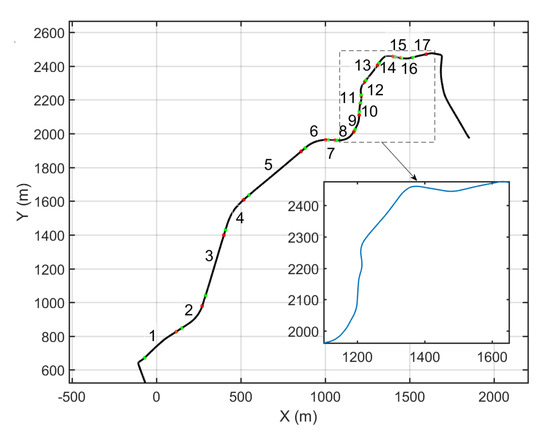 Road course and sections; green dots show the entry of a section, and red dots show the exit of a section.