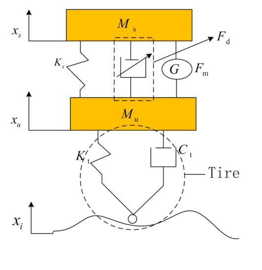 Assuming that the sprung mass and the unsprung mass are rigid bodies, the motion is only perpendicular to the ground direction. The suspension system has a linear stiffness coefficient and the damping coefficient. The effective stroke of the damper and the linear motor is not exceeded in the process of motion. Furthermore, the dynamic model of the regenerative suspension system shown in Equation (1) is established.