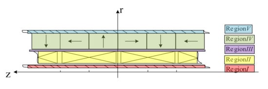 Moving-coil type TPMLM is selected in this paper. Compared with the same size moving-magnetic one, it has a higher energy density, the smaller mass of moving magnetic parts, and higher electromechanical conversion efficiency. The structure diagram is shown in Figure 2, which is divided into I-V according to the material medium. The five areas are core area, winding area, air gap area, permanent magnet area, and back iron area. The magnetic tile adopts the Halbach magnetization arrangement method. This method has the highest average magnetic field energy density. The axial magnetic field distribution accounts for a high proportion of the fundamental wave component, thus reducing the electromagnetic conversion output harmonic content [12].