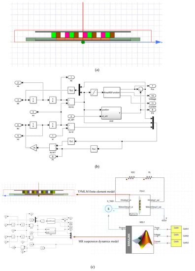 Schematic diagram of the MR regenerative suspension system simulation platform. (a) A finite element simulation model, (b) Suspension dynamics simulation model, (c) Joint simulation model.