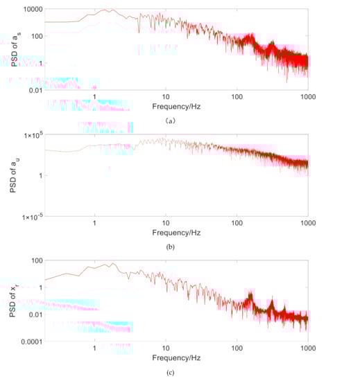 Figure 6 shows , and under random road excitation. It can be seen that the first resonance point of the MR regenerative suspension system is 1.5 Hz, and the second resonance point is about 9.5 Hz, which is consistent with the transmission rate under the above variable amplitude harmonic excitation. It is also indicated that the addition of TPMLM does not significantly change the system stability.