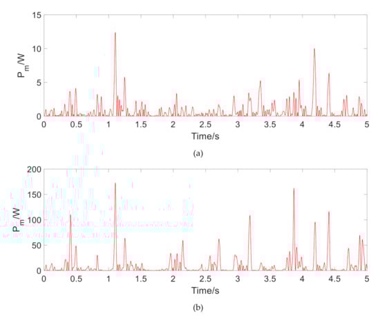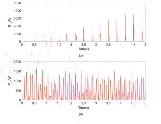 Under the single-frequency harmonic road excitation in Equation (14), above smooth road excitation, and random road excitation, the output regeneration characteristics are observed. The average output power and the effective power value P are employed as the evaluation indicators, as shown in Equations (15) and (16).