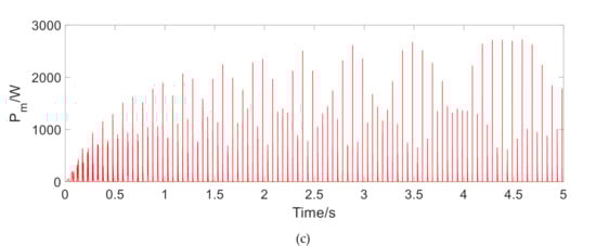 The instantaneous output power of regenerative motor under sinusoidal excitation. (a) Output power at 1.5 Hz, (b) Output power at 6 Hz, (c) Output power at 10 Hz.