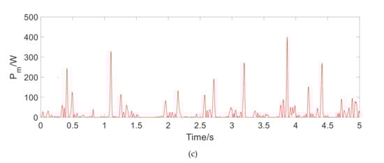 The instantaneous output power of regenerative motor under the random road. (a) Output power under A-class road, (b) Output power under B-class road, (c) Output power under C-class road.