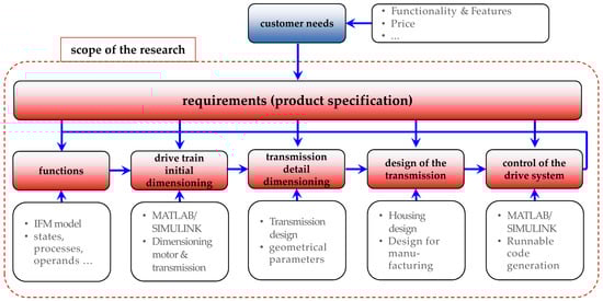 For the synthesis of the drive system of the balanced two-wheel scooter, a process with steps shown in Figure 10 is implemented. The blue-colored steps are part of an automatic process chain which is implemented in a graph-based design language (GBDL). Each process step is linked to the main requirements of the vehicle or sub requirements derived from them and from the information, and therefore parameters from the previous process.