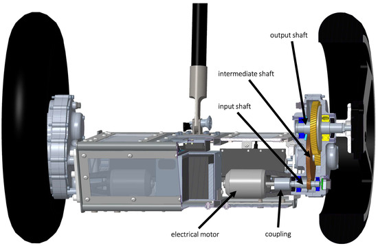 The main focus of this paper is on the digital design process. The object of this process is a drive system for a balanced two-wheel scooter. Due to the need to balance the vehicle and simultaneously to follow a given path, the use of two individual actuators on each wheel and an elaborate control system with a continuous tracking of the inclination angle is inevitable. Due to many aspects such as simplicity, the choice of electrical motors as actuators is logical. An initial design step was needed in order to determine whether a gear system is necessary and which transmission ratio would be beneficial for certain configurations. It became apparent that designs which use a transmission are more beneficial for the given set of requirements (including system costs), leading to the general drive system configuration shown in Figure 2.