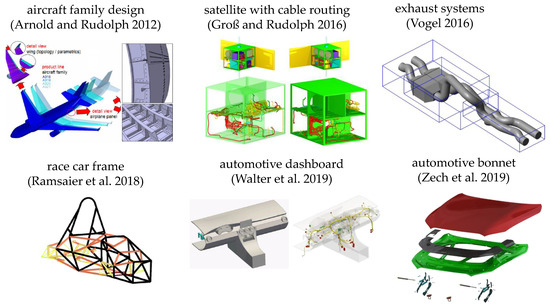 Graph-based design languages provide a powerful engineering framework through their automated, systematic variation and calculation features, and have the capability to feed into any relevant CAE tool. They map product information into vocabulary and rules typically based on the Unified Modeling Language (UML). These languages permit machine execution and the reuse of design and manufacturing knowledge, through automated model generation, calculation and simulation. They allow the generation of a large number of design alternatives based on parameter variation across multiple simulation tools, in a fast and automated manner [8,9,10,11,12,13,14]. Figure 3 shows some successful applications of graph-based design languages.