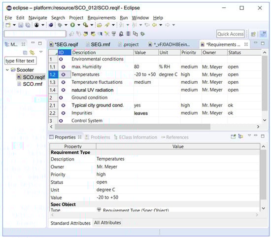 Requirements are a decisive factor in system development projects in industry (compare e.g., [15]). Studies [16,17] show that four of ten top risks in projects are strongly connected with requirements and that only 52 percent of the originally intended requirements appear in the final released version of the product. An enormous amount of literature concerns requirements management and requirements engineering; a good overview can be found in [18,19,20]. Additionally, international standards exist: the ISO standard 29148 “Systems and software engineering—Life cycle processes—Requirements engineering” [21], the ISO standard 15288 [22] “Systems and software engineering—Systems life cycle processes” and the quality management norm ISO 9001 [23]. Today, several tools for requirements management are currently available; a comprehensive overview is given in [24]. Additionally, open source products are available, which can provide extensive functionality, such as the Eclipse (Eclipse is an open-source programming tool for developing software of various types which is managed by the Eclipse Foundation, Ottawa, Canada, a non-profit corporation with the mission to manage the Eclipse open source community and its projects)-based tool “ProR”; Figure 6 shows an example of the requirements of the balanced two-wheel scooter modelled in ProR.
