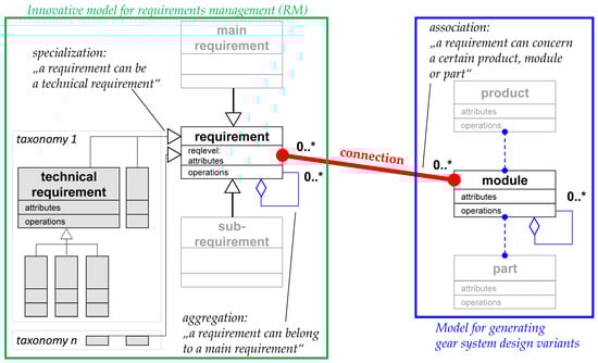 In earlier research, a concept for model-based requirements management was developed [25]. The central objectives of the research were to demonstrate an integration of this model-based requirements management with a development process of gear systems by means of applying graph-based design languages. For the innovative approach, two models were developed—one model for generating various gear system design variants and a second model for requirements management (RM), which includes state of the art RM know-how. The RM-model, as well as the model for product design variants, has been implemented by means of graph-based design languages that are based on UML (Unified Modelling Language). For the explicit digital mapping, the definition of an interface between both models (“requirements” and “geometry synthesis and simulation”) is needed. The model-based requirements management has, in very general terms, three main aspects, which could also be understood as dimensions (Figure 7).