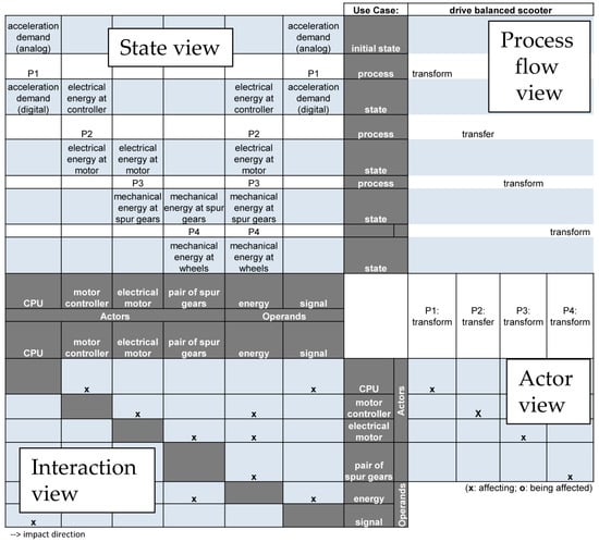 The domain of product functions describes the solution concept of a product on an abstract level and supports the description and synthesis of complex, multi-domain products. This section describes possibilities to expand the applicability of graph-based design languages into the domain of product functions. These possibilities allow one to cohesively link integrative function modelling to product structures and intend to close the gap between the early, abstract stages and the systematic, concrete design generation and validation with relevant simulation tools. The approach is based on the integrated function modelling framework (IFM [26]), which is intended to provide development engineers with an integrated, cross-disciplinary approach for modelling system functionality. In this context, a function is defined as an intended or already perceivable behavior of a technical system to fulfil a specific task. The respective function information is presented in associated views; an example for the use case “drive balanced scooter” is given in Figure 8.