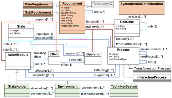 The state view (upper left) represents the states of operands, as well as their changes associated with related processes. The process flow view (upper right) qualitatively visualizes the flow of sequential or parallel (interaction or transformation) processes related to a specific use case. The interaction view (lower left) maps the bilateral impacts between actors and operands and represents the structure of the system. The actor view indicates the involvement of one or more actors in the realization of individual processes. For linking this approaches with the concept of graph based design languages, the class diagram of IFM has been re-modelled in UML in order to be able to use it in a design language [27]. The respective class diagram can be seen in Figure 9.
