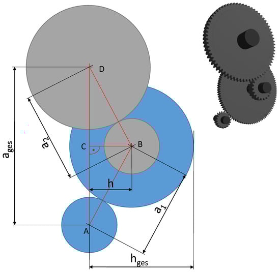 The two center distances of the gear stages ( and ) are varied in the range of 40–90 mm for the scooter gear system use case. The size of a bearing system for the shafts limits the minimal distance of the shafts at 40 mm. The upper bound of 90 mm is estimated in terms of the number of variants. In addition, a valid total center distance of 112.5 mm can only be achieved if the following geometrical relationship is given: