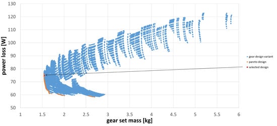 The properties of the gear set mass and the power loss are shown for the generated variants in Figure 14. The investigation for the scooter gearbox produces 13,892 valid geometrical variants of the gear set.