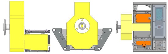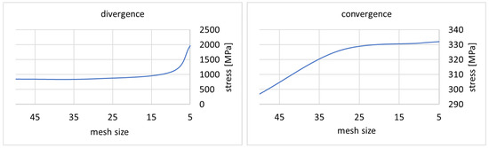 According to the vehicle requirements, an installation space model for the drive unit is generated. The model shown in Figure 15 presents three different views, including the possible installation space for the drive unit (yellow marked geometry), which absorbs the previously specified interfaces to the gear set, such as the connection to the wheel hub and the attachment points of the frame. According to the requirements, it should be possible to install the drive unit on both sides of the balanced two-wheel scooter. For this reason, special care was taken to ensure that the attachment points and the motor, as well as the output shaft, are arranged symmetrically to each other. Based on the automatically generated gear set and the defined interfaces, a first model of the gearbox housing is created, limited by the installation space. The detailed model is created in the design software Creo Parametric 5.0. A finite element method (FEM) simulation is generated in Creo Simulate to verify the required load cases (Creo Parametric 5.0 as well as Creo Simulate are software tools of the PTC Inc. from Boston, MA, USA). After the boundary conditions are transferred into the model, the mesh size is investigated by a convergence and divergence study. For the studies shown in Figure 9, the elemental stresses are investigated according to von Mises. The divergence study is used to check the mesh size in the border areas and the convergence study of the mesh fineness in the unbounded area [33]. For each of the studies, one element is tested with different mesh sizes (visible in Figure 16).
