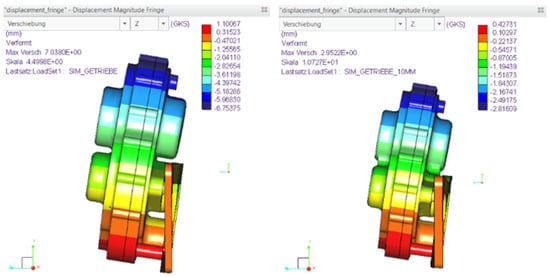 The divergence study shows that no valid analysis of the stresses in the border areas can be achieved with a grid fineness of less than 10. The convergence study shows that no significant change in the stresses in the unbounded area can be detected from a mesh size of less than 25. Accordingly, a mesh size of 10 is used for the more detailed analysis of the load cases. A further advantage of this mesh size is the computing time, which is kept to a minimum. This is decisive for the optimization process, in order to simulate a high value of different geometries by achieving valid results. The above-mentioned optimization of the component geometries mainly concentrated on the component displacement, as the element stresses in all components are consistently lower than the critical material parameters allow. The comparison shown in Figure 17 represents the deflection of the drive unit in the Z-direction viewed from the side.