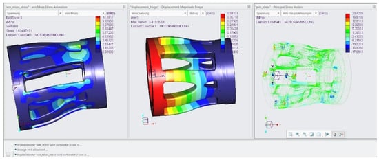 The motor is coupled to the input shaft of the transmission with a flexible coupling. Therefore, two criteria can be defined to investigate the component. On the one hand, the critical material parameters of PLA are not allowed to be exceeded and on the other hand the displacement of the connection may not exceed the maximum possible flexible coupling deflection (max. angle of ) [34]. Otherwise, bending loads could damage the coupling and increase bearing loads. As shown by the simulation results, neither of the two criteria are reached or even exceeded by the critical loads.