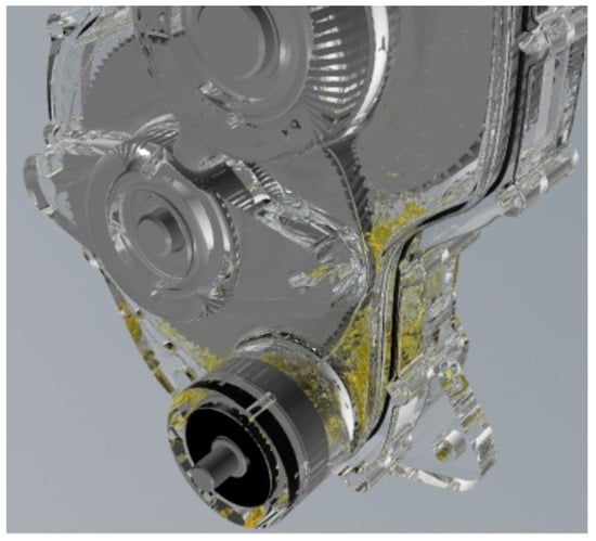 Another crucial aspect was the supply of lubricant in the gear system. The requirements for the oil system included sealing, as well as ensuring a sufficient supply of lubricant to the gears and bearings. The first one is realized by using an O-ring seal cord and proper radial shaft seals. The second is checked by a fluid simulation. The purpose of the simulation is to determine the amount of oil required for reliable operation of the drive train and how well the individual bearings and gears are supplied with lubricant. Figure 19 shows a screenshot from the simulation set up in the software PreonLab. PreonLab is a fluid simulation tool developed by the FIFTY2 Technology GmbH from Freiburg, Germany. Based on the results of the simulation, a filling level of 50 mL is determined to be appropriate for the safe operation of the transmission.