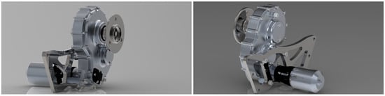Subsequently, the derivation of load cases and the associated evaluation is shown; also, the final design of the balanced two-wheel scooter drivetrain is presented. Due to the target weight of the scooter and a maximum carrying capacity of about 100 kg, and an overall weight of 145 kg as a main vehicle requirement it is possible to elaborate sub requirements for load cases. Besides the installation space model, the critical load cases are very important for the ongoing drivetrain design. One critical load to evaluate the mechanical integrity is the curbstone crossing. The structure of the housing and mountings should withstand such a curb crossing at a driving speed of km h−1. It is assumed that the vehicle passes over a curbstone with a height of mm. According to the following Equation (5) mentioned in [32], the peak vertical acceleration during the curb crossing is calculated by the traction wheel radius r, the height of the curb h and the velocity of the vehicle v: