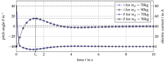 An initial estimate for the maximum motor moment or current input was done in Section 5 in order to design the transmission. It can be seen that the trajectories of the pitch angle satisfy the conditions of the max overshoot, overshoot time and settling time for the case of a passenger of kg and kg, but in the second case, the maximum motor current A is violated. For the second case, a redesign of the scooter is necessary; for the first case, a valid scooter design is found, which satisfies all requirements. With the second case, a redesign could be done by using the maximal needed current of the closed loop model as an input in the transmission design.