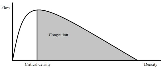 Ramp metering is a method for measuring and controlling traffic that is applied to entrance ramps on highways. The measurement of the number of vehicles is performed through sensors located at the entrances and exits of the highway. The purpose of this method is to control the entry of vehicles in the highway so to make the best use of the capacity of the highway [6,8],. Specifically, the ramp has a demand for traffic d0 expressed in vehicles per hour (vh/h), while r0 (vh/h) is the traffic on the ramp regulated by signs, qc (vh/h) the highway capacity and qin (vh/h) the flow of the main stream. When a traffic jam occurs, the maximum output current qout (vh/h) is less than the normal main current flow qc. The above phenomenon is called capacity drop and the goal is to avoid it as much as possible [9]. The capacity drop phenomenon can be seen in flow—density chart in Figure 1. In cases where ramp metering is not applied, capacity drops tend to occur quite often. Therefore, with the use of ramp metering and the continuous retrieval and analysis of traffic data, this phenomenon can be alleviated. Then, the flow of vehicles is smooth and the traffic times are reduced on the main lanes. On the other hand, there is a possibility of creating a long queue of vehicles on the entrance ramp and correspondingly long delays there. Thus, it is easily understood that a balance must be maintained between the traffic on the highway and the length of the queue at the entrance.