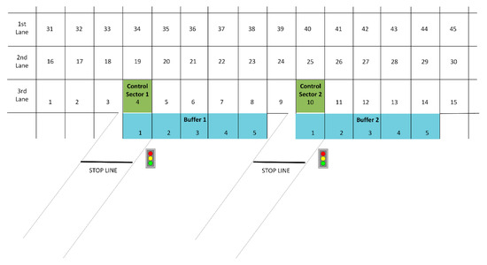 The final model, which is very close to the real conditions of a highway, consists of three lanes and two entrance ramps. Moreover, the entrance ramps have one lane and the auxiliary entrance lane has a capacity of five cars. The main stream of the highway consists of 45 different sectors whereas each sector can host one car (capacity of each sector is equal to 1). The 45 sectors are distributed evenly in the three lanes—15 sectors on each lane (1–15 right lane, 16–30 middle lane, 31–45 left lane). The cars that enter the highway through the ramps firstly move in the auxiliary lane (buffer). Cars can change lanes in the main stream and can move only forward in the road. The entrance of a car into the main stream of the highway or on to a ramp happens randomly. A depiction of the model used for this study is shown in Figure 3.