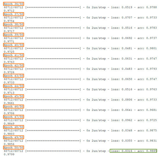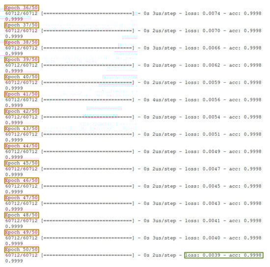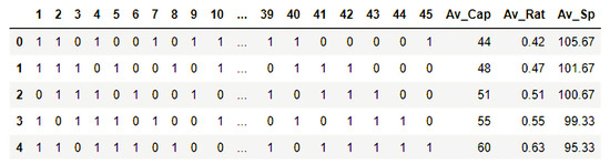 For the needs of this study, a neural network was developed for multiclass classification. The produced dataset consists of 108016 observations, with 48 input variables and two output variables as described above. An indicative snapshot of the input in the studied neural network is depicted in Figure 4: