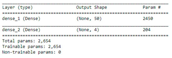 Moreover, the dense class (https://keras.io/api/layers/core_layers/dense/) was used to create the required network layers. The implemented model consists of 48 input features and one target variable. In addition, it has two hidden layers, one of them with 50 nodes and an output layer that gives four output variables, required for the forecast values (0, 1, 2 and 4) as mentioned above. Figure 5 features some indicative information about the characteristics of the neural network layers.