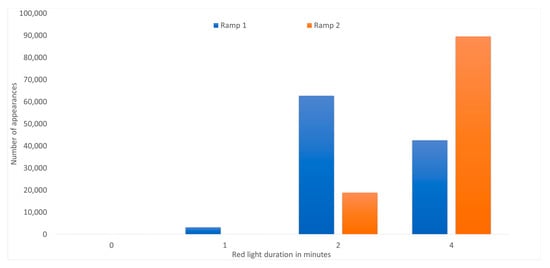 By observing the results above, it is obvious that the closer to the real-world the scenario lies the more demanding the algorithms are as they require more computational power and execution time. Therefore, the need to develop a machine learning algorithm using a neural network is pertinent. The neural network developed used as training and test data the data generated by the latest implementation scenario with three lanes and two ramps. The neural network was trained to produce very fast results and specifically result in the optimal the duration of the red light on each ramp. The results of the data mining scenario considering the duration in minutes for each ramp for the 108,016 discrete time instances are depicted in Figure 6.