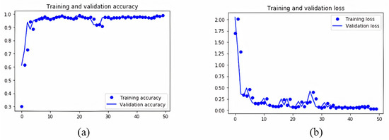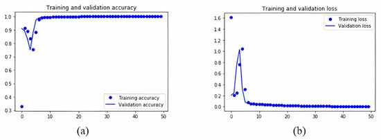 Accuracy and loss of the test set for ramp 2 are particularly positive as well as they have an accuracy of 99.99% and a loss of just 0.36%. Similarly to ramp 1, the diagrams for the training and test sets considering the accuracy and loss for ramp 2 are presented in Figure 13: