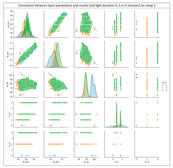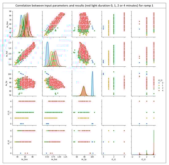 Similarly, Figure 9b shows the training and test loss for the 50 epochs executed for ramp 1. This observation is just as important as the previous one, due to the fact that it confirms the reliability of the predicted results. All of the above results support the reliability of the neural network results as well as the high-quality of the training data provided. Figure 10 presents a synthesis of pairplot charts, where the correlation of the input data for the developed neural network model with the acquired results is depicted. More specifically, in the presented pairplot (Figure 10), each input parameter is combined with all the other (provided) inputs and it is examined whether the combination of these groups correlates the outputs of the developed neural network. In other words, the provided pairplot allows us to check and depict both distribution of variables and the relationship between them, highlighting this method as a great approach for identifying trends for the specific algorithm. The x-axes namely are: the average density (Av_Den); average ratio (R) (Av-Rat); average speed (Av_Sp); red light duration for ramp 1 (r1_t1) and red light duration for ramp 2 (r2_t2), respectively. The y-axes namely are: the average density (Av_Den); average ratio (R) (Av-Rat); average speed (Av_Sp); red light duration for ramp 1 (r1_t1) and red light duration for ramp 2 (r2_t2). Every row shares the same y-axis and every column shares the same x-axis in Figure 10. The blue points are for 0 min red light duration for ramp 1, the yellow for 1 min, the green for 2 min and red points for 4 min respectively.