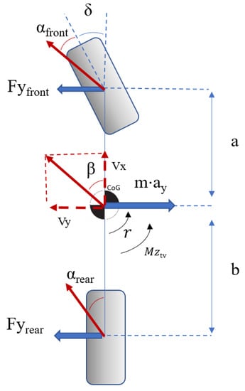 The irruption of electric technology in the automotive industry is setting a new and important milestone in automotive history. The proliferation of electric vehicles in the coming years seems clear, not only by looking at the different roadmaps but also by considering the necessities that are arising from the social, economic, mobility, and ecology fields. Electric technology brings also several advantages to the field of vehicle dynamics control. The ability (and ease) of installing an electric motor in every single wheel introduces another degree of freedom in terms of vehicle handling [1,2,3]. Apart from this, the short response time of the electric motors provides a more effective transmission of the motor torque to the wheel [4]. Direct Yaw Moment Control (DYC) systems, also recently denominated as Torque Vectoring (TV), take advantage of these benefits on vehicles with independent motor configurations, as motor torque can be distributed independently on each wheel. In the last three decades, DYC has been intensively investigated. Many contributions have been proposed to the employment of different control methods for DYC, especially in the last ten years, given the torque distribution freedom of electric powertrains with independent motors, but also in some cases due to the advancements made in electronic differentials. Control methods such as PID (Proportional Integral Derivative), LPV (Linear Parameter-Varying), LQR (Linear Quadratic Regulator), LQG (Linear Quadratic Gaussian), H-infinity, Fuzzy Logic, SMC (Sliding Mode Control), and MPC (Model Predictive Control) have been investigated in recent years, some of them with a combination of feedforward techniques. Typical control variables in such controllers are yaw rate and sideslip angle.