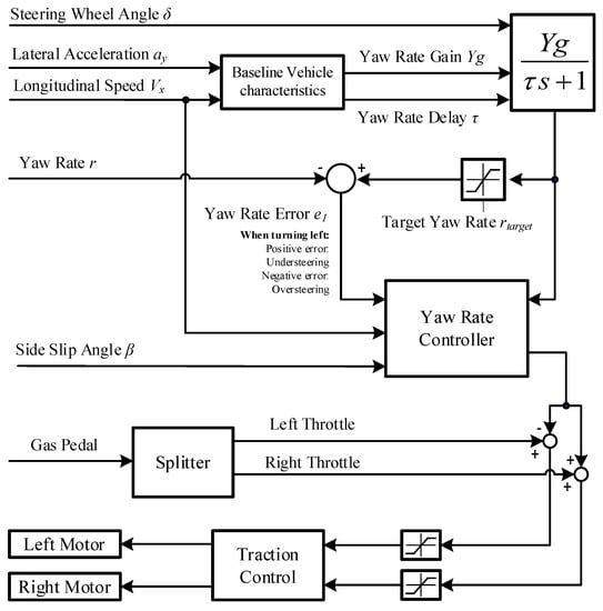 - Fu, C.; Hoseinnezhad, R.; Jazar, R.; Bab-Hadiashar, A.; Watkins, S. Electronic differential design for vehicle side-slip control. In Proceedings of the 2012 International Conference on Control, Automation and Information Sciences (ICCAIS), Saigon, Vietnam, 26–29 November 2012; pp. 306–310. [Google Scholar]