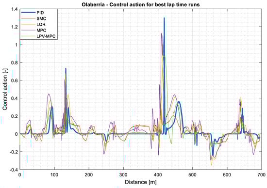 Table 8 and Table 10, and Figure 11 comparethe control action of each controller. In this case, the differences are much clearer than in lap times. The PID controller is much less intrusive than the others are, and its lap time is less than one-tenth slower than the LPV-MPC in each circuit. Despite its simplicity, the performance of the PID controller is remarkable.