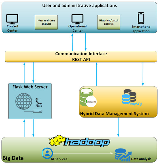 In addition to the Flask server, the hybrid data management module consists of two databases: an SQL and a NoSQL database. The MySQL [38] is used as a relational database in order to provide near real-time analysis and visualization of the data. On the other hand, the MongoDB [39] is chosen so as to handle historical and batch analysis as well as management of the gathered data. The development of this hybrid data management scheme is suitable for big data management, manipulation, and analysis operations.